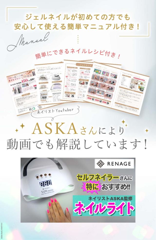 人気YouTuberネイリストのASKAさん監修第二弾!「初めてのジェルネイルだから心配・・・。」「どんなライトが出ているか怖い・・・。」そんなお悩みをお持ちの方にも安心してお使い頂けるよう、ジェルネイルの基本的な塗り方から手肌に優しいライトの使用方法まで、分かりやすい解説動画をお付け致します!取扱説明書と解説動画を見ればジェルネイルを始めたての初心者さんでも簡単にお使い頂けます!