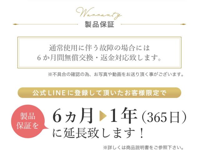 商品に万が一不具合等がありましたらストア専用LINEかお問合せフォームからお気軽にご連絡下さい。また、ストア公式LINEにご登録頂けると180日→365日に延長保証をさせて頂きます。
