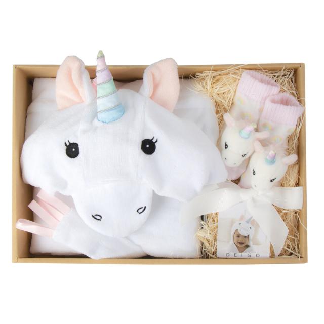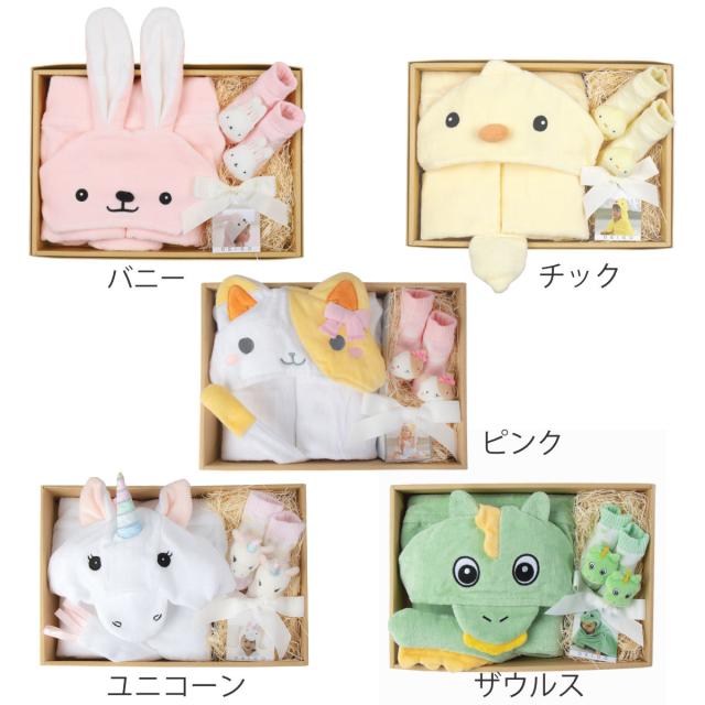 フードバスタオルとラトルソックスが一緒に箱に入ったセットです。フードバスタオルは季節を問わず使え、ラトルソックスは靴をはかせる機会のまだない赤ちゃんの冷え防止など、可愛いけど実用的で贈り物としても喜ばれます。