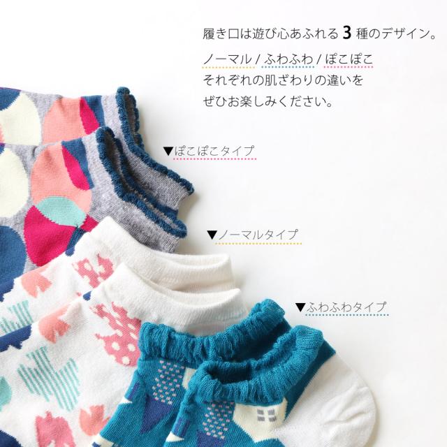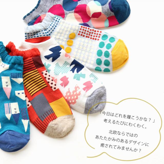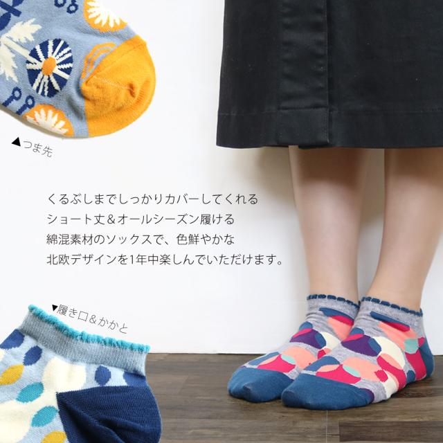 くるぶしまでしっかりカバーしてくれるショート丈&オールシーズン履ける 綿混素材のソックスで、色鮮やかな北欧デザインを1年中楽しんでいただけます。
