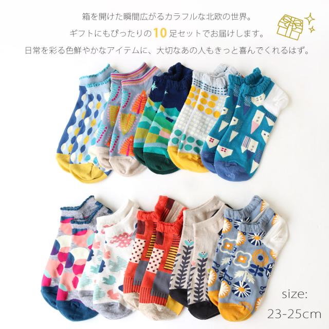 送料無料 靴下 レディース おしゃれ 10足セット 北欧デザイン ショート丈 ソックス 綿混 カラフル かわいい 花柄 ドット 水玉 鳥 個性的 くるぶし スニーカー 23-25cm