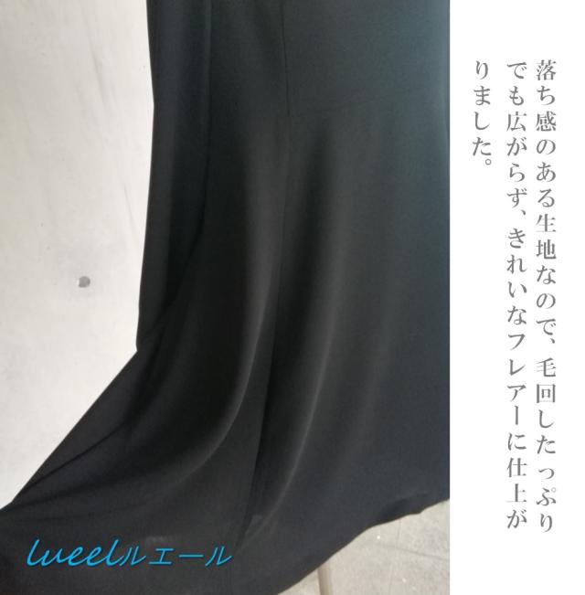 身頃は少し、体に合わせたIライン、裾にかけてフレアーを出したスカート部分はお腹周りが気にならず、楽で足長効果があります。