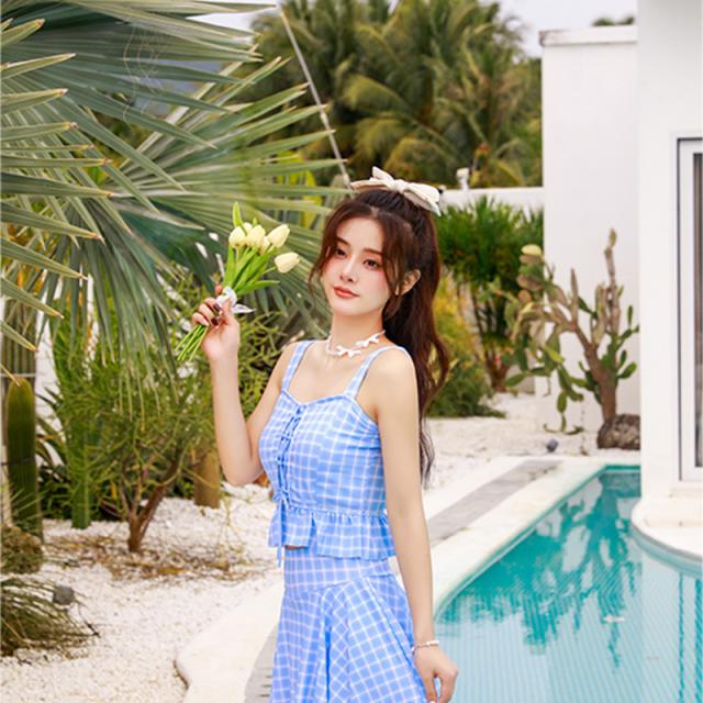 水着 レディース ビキニ 2点セット スイムウェア ビーチウェア セパレート 胸パッド付き チェック柄 韓国風 着痩せ 学生 プー