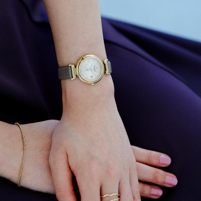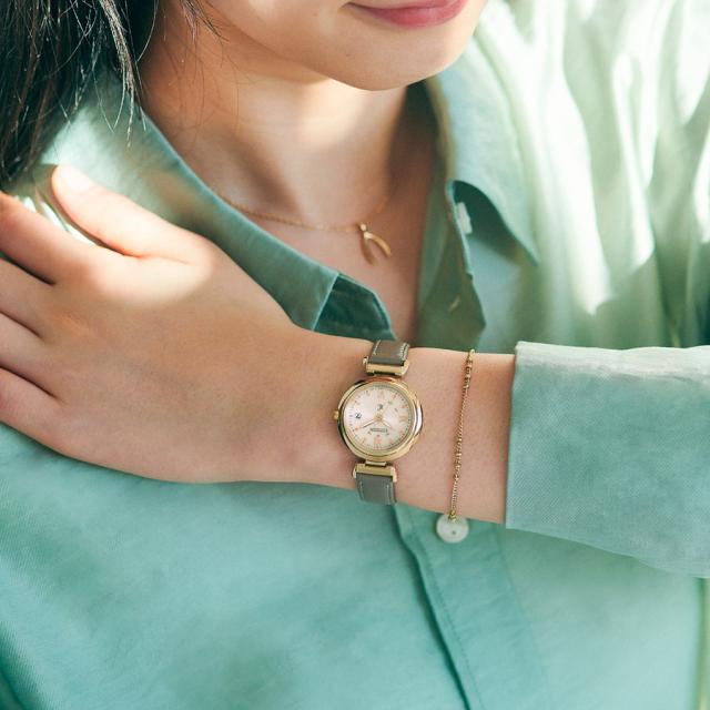 イエローゴールドのモデルには、グレージュの革ベルトを合わせて、ナチュラルな印象に仕上げました。
