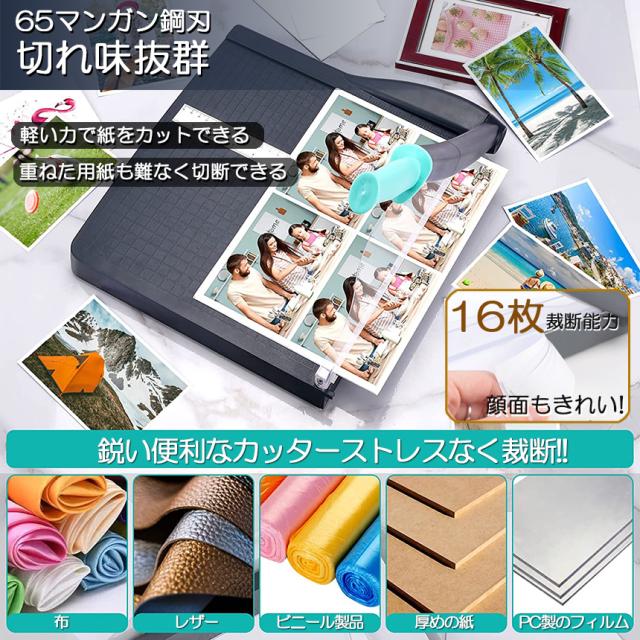 【耐久性ペーパーカッター】本裁断機は耐久性ABSプラスチック台座と鋭利な65マンガン鋼刃を採用し、紙の束を簡単にカットできます。裁断機は紙を305mmの長さに切断でき、一度に最大16枚のコピー用紙を裁断可能です。【製品仕様】製品サイズ:347X310X40mm、重量:約1kg、切断可能サイズ:305x305mm、ペーパーカッターの適用可能な切断範囲:A4、A5、B5、B6、B7