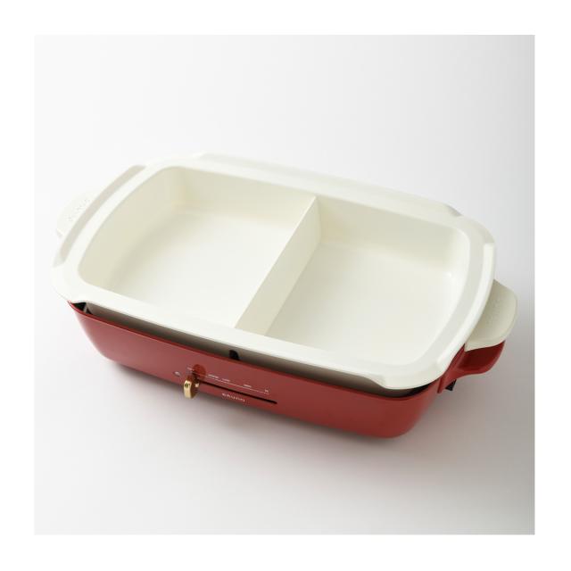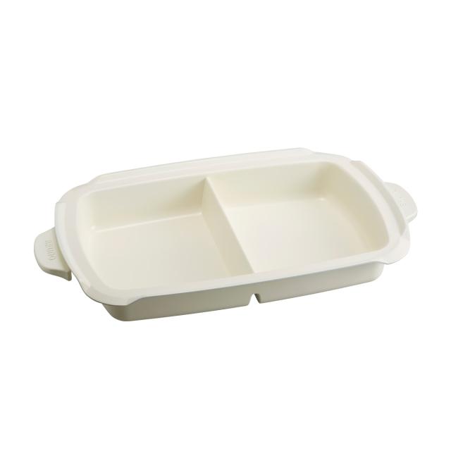 2種類のお鍋や煮込み料理を同時に愉しめる、ホットプレートグランデサイズ専用オプションの深鍋。仕切りのついたセラミックコート鍋は、同時に2種類のお料理をお楽しみ頂けます。表面はセラミックコート加工により、キズや焦げがつきにくくお手入れも簡単。食卓やパーティシーンでも大活躍。