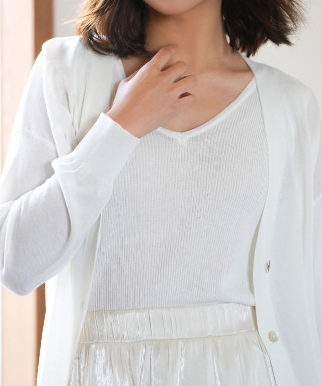 大胆に開いたデコルテラインが目を惹くVネックサマーリブニット。