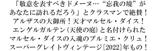 「敬意を表すべきドメーヌ…“忘我の境”があなたに訪れるだろう」とクラスマンで絶賛!アルザスの大御所!天才マルセル・ダイス!エンゲルガルテン(天使の庭)と名付けられたマルセル・ダイスの入魂のプルミエ・クリュ!スーパーグレイトヴィンテージ[2022]年もの!■さまざまなギフトアイテムをご用意しております。