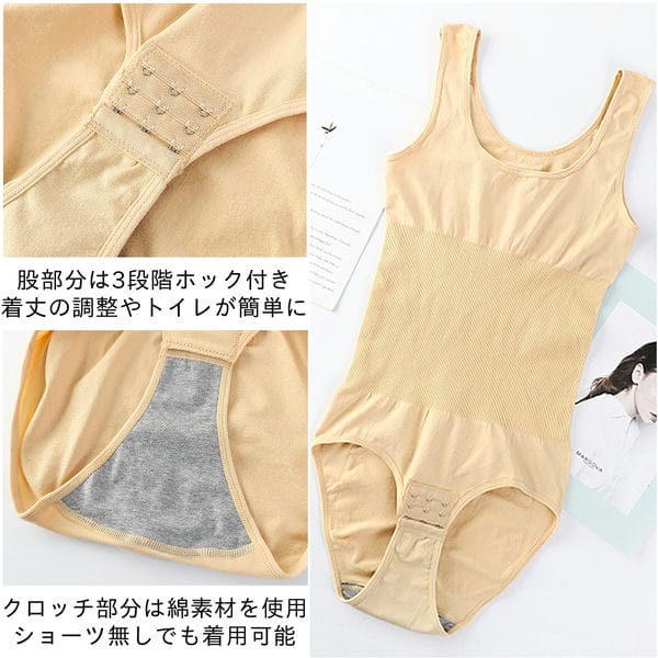 - 補整下着やボディースーツと言うよりタンクトップとショーツの一体化みたいな感じですが、凄く収縮性があるので装着しやすくて締め付け感も程よくあり、股下にホックがあるのでトイレも慌てずに行けるので凄く気に入りました。