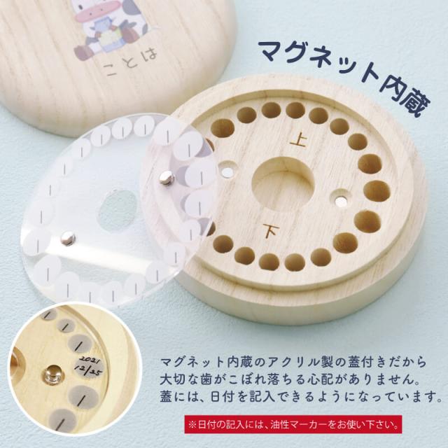 子供の成長はあっという間! 歯の生え変わりも、もちろん大切な思い出の一つです。 抜けた乳歯、記念に残しておきたいけれど方法が・・・ そんなお母さんにぴったりなのが 乳歯ケース ♪ 当店オリジナルの干支イラスト入り 乳歯入れ で お子さんと一緒に楽しく 1. 乳歯ケースの4つのメリット 乳歯ケースは、ただ抜けた乳歯を保管するだけではなく、 こんなメリットがあるんです♪ ・ 思い出を残せる 乳歯は、お子さんが成長していく上での貴重な思い出の一つ。 長期保存できるケースを作ることで、お子さんの成長記録を残すことができます。 子供が大きくなった時、乳歯ケースを手に取って思い出話をすれば、 家族の絆を深めるきっかけにもなりますよ! ・ 子供の不安を和らげる 乳歯が抜ける時は痛みを伴うこともあるので、 中には歯が抜けることを怖がってしまう子も… 可愛いデザインのケースがあれば、不安も軽くなるはず。 乳歯ケースを使うのが待ち遠しくなり、 歯の生え変わりが楽しみになることでしょう。 ・ プレゼントに最適 ご自身のお子さんへのプレゼントにはもちろん、親戚や友達へのギフトにも最適です。 お子さんのお名前を彫刻することで、より特別感のある贈り物に♪ 出産祝い や、 クリスマスプレゼント などにも おすすめ です。 2. 当店だけのこだわりポイント3点 ・ 高級桐材を使用 当店で使用する 桐材 は、ノンホルムアルデヒドのAランク。 木材の中でも非常に軽く、丈夫で、防虫効果が高いことから 長期保管に最適の素材です。 また、 国産 の桐材は天然の美しさがあり、 高級感のある仕上がりになります。 ・ 子供にも扱いやすい設計 お子さんの手に触れるものだから、 安心・安全にも配慮しました。 小さな手にも優しく納まる丸みのあるフォルム。 職人が滑らかになるまで妥協を許さず丁寧に磨きあげました。 乳歯入れの蓋は力を入れなくても開けられるように、 あえて緩く設計してあります。 中にはマグネット付きのアクリル蓋がついているから、 こぼれ落ちてしまうことなく大事な歯を保存します。 ・ 歯が抜けた日付を記録できる アクリルのふた部分には、 歯が抜けた日付の記入が可能。 “これはいつ抜けた歯?” と混乱してしまうこともなく 正確に記録することができます。 また、抜けた歯の位置もわかるよう収納していただけます。 3. 選べる12種類! かわいい 干支 デザイン 当店専属のイラストレーターがデザインした 12干支 の可愛い 動物 イラストを 乳歯ケースの蓋にプリントいたします。 お子さんの生まれ干支にあわせてお選びください。 〔 十二干支の動物デザイン 〕 ・ 子 ( ねずみ ) ・ 丑 ( うし ) ・ 寅 ( とら ) ・ 卯 ( うさぎ ) ・ 辰 ( たつ ) ・ 巳 ( へび ) ・ 午 ( うま ) ・ 未 ( ひつじ ) ・ 申 ( さる ) ・ 酉 ( とり ) ・ 戌 ( いぬ ) ・ 亥 ( いのしし ) 4. 名入れサービス イラストの下にはお子様のお名前をプリントいたします。 名入れ可能でーつーつ木目や色が異なるから世界にただ一つだけ! 長い時間をかけて子供の成長を刻み込む乳歯ケース。 使うたびに思い出がつもり、愛着を感じるようになるアイテムです。 お名前入りになることでさらに特別感がUP! うちの子専用の乳歯ケースに、 お母さんもお子さんも感動すること間違いなしです。 ≪ こんなシーンにおすすめ ≫ ・ 子ども の 乳歯 が 抜けた 時に ・ 子供の 誕生日プレゼント ハーフバースデー に ・ 入園祝い 卒園祝い の 記念品 として ・ 友達 や 親戚 への 出産祝い に ・ 甥っ子 姪っ子 お 孫 さんへの クリスマスプレゼント に |