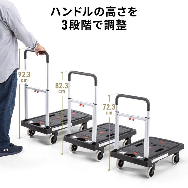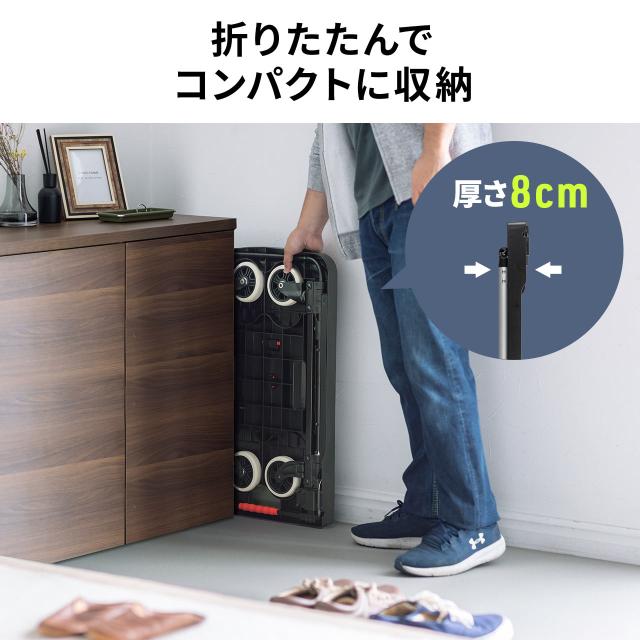 ⇒ご購入の前にご確認下さいハンドルとキャスターを折り畳めるから収納スペースを削減できる。薄さ8cmになる折りたたみ台車。使う人に合わせて高さを3段階で調整できるハンドルを搭載。360度回転する前輪でスムーズに方向転換。滑らかに動くエラストマーキャスターを装備。耐荷重80kg。【WEB限定商品】