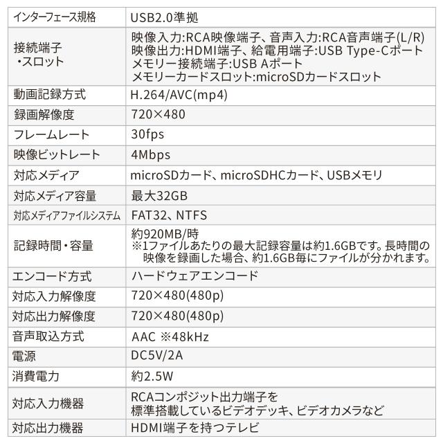 ■対応入力機器:RCAコンポジット出力端子を標準搭載しているビデオデッキ、ビデオカメラなど■対応出力機器:HDMI端子をもつテレビ、モニター