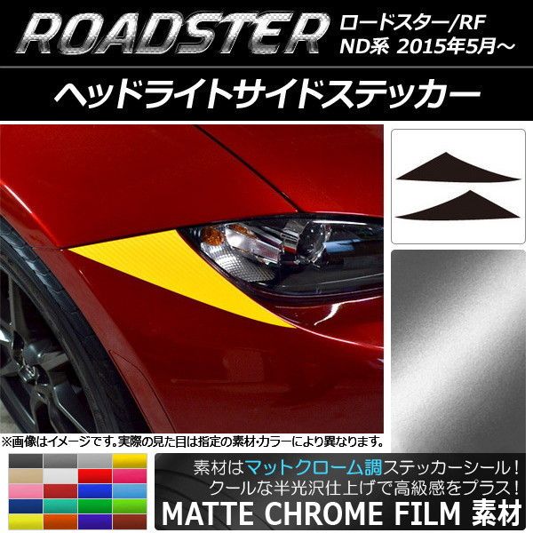 ヘッドライトサイドステッカー マットクローム調 マツダ ロードスター/ロードスターRF ND系 2015年05月〜 選べる20カラー 入数:1セット(2枚) AP-MTCR2409 カラー: ブラック ホワイト レッド ブルー イエロー グリーン オレンジ パープル ピンク ネイビー ブラウン ボルドー ゴールド シルバー ガンメタリック マゼンタ ライトグリーン ライトブルー ライトゴールド シアン