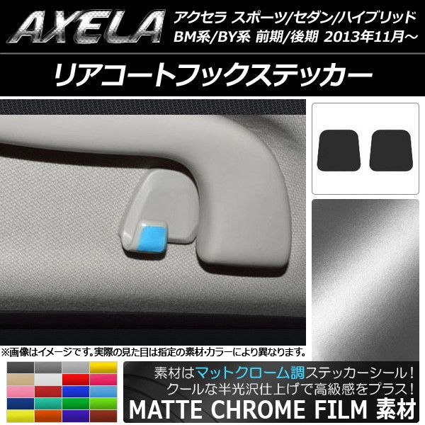 リアコートフックステッカー マットクローム調 マツダ アクセラ スポーツ/セダン/ハイブリッド BM系/BY系 選べる20カラー 入数:1セット(2枚) AP-MTCR1466 カラー: ブラック ホワイト レッド ブルー イエロー グリーン オレンジ パープル ピンク ネイビー ブラウン ボルドー ゴールド シルバー ガンメタリック マゼンタ ライトグリーン ライトブルー ライトゴールド シアン