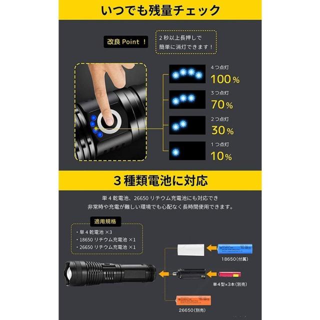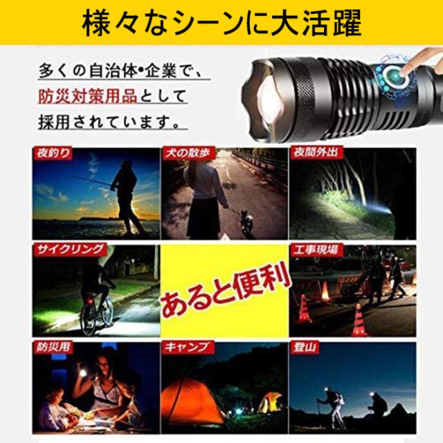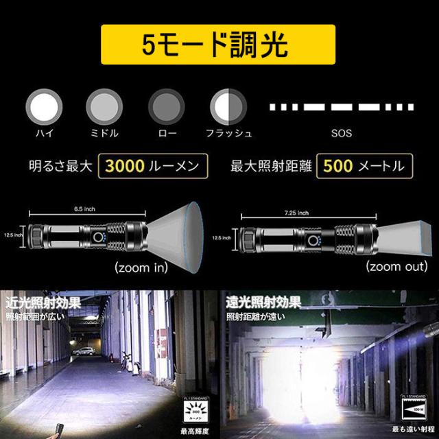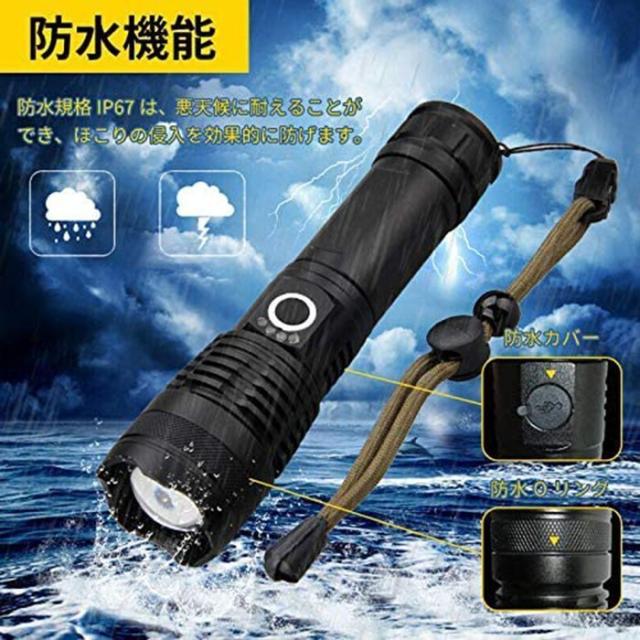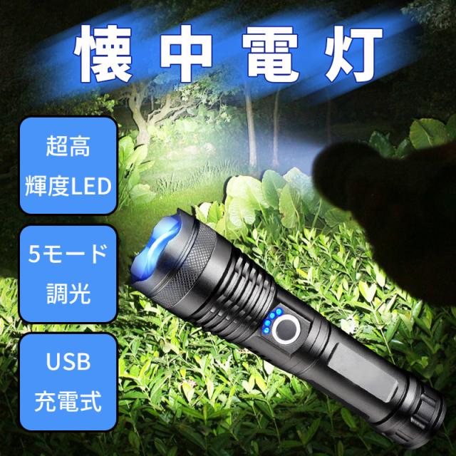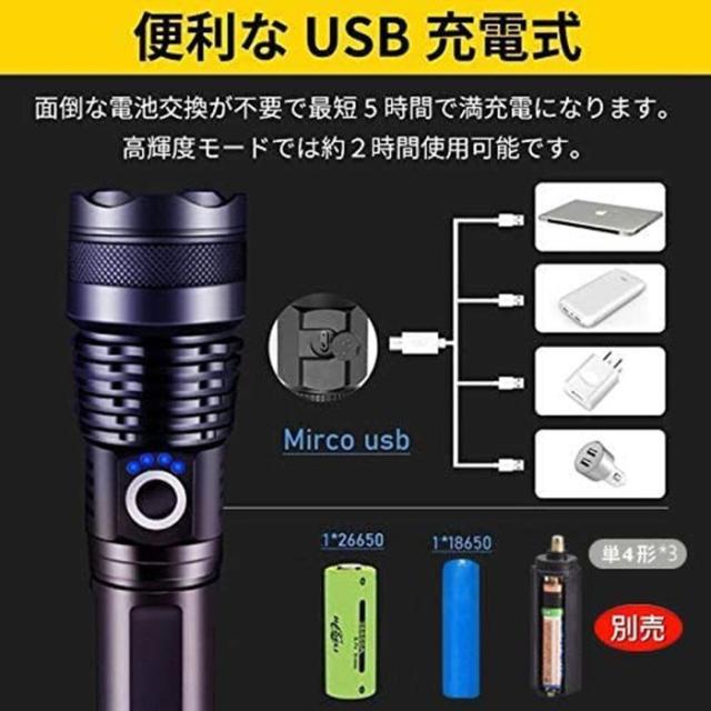 懐中電灯 LEDライト 5モード調光 超高輝度3000ルーメン CREE XHP50 四核Led USB充電式 充電池付き 乾電池使用可 ハンディライト 防災グッズ 地震 停電対策 登山 釣り用 作業用