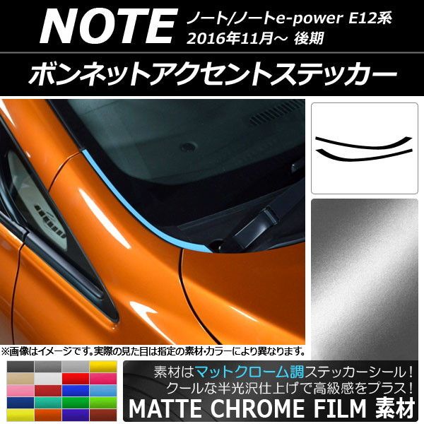 ボンネットアクセントステッカー マットクローム調 ニッサン ノート/ノートe-power E12系 後期 2016年11月〜 選べる20カラー 入数:1セット(2枚) AP-MTCR3268