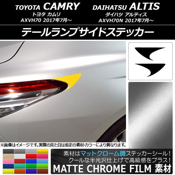 テールランプサイドステッカー マットクローム調 トヨタ/ダイハツ カムリ/アルティス XV70系 2017年07月〜 選べる20カラー 入数:1セット(2枚) AP-MTCR3128 カラー: ブラック ホワイト レッド ブルー イエロー グリーン オレンジ パープル ピンク ネイビー ブラウン ボルドー ゴールド シルバー ガンメタリック マゼンタ ライトグリーン ライトブルー ライトゴールド シアン