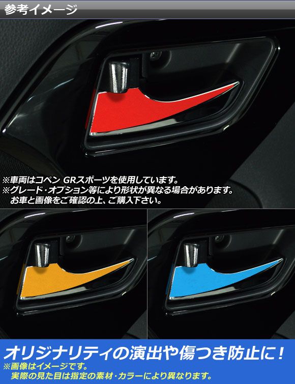 インナードアハンドルステッカー マットクローム調 コペン ローブ/セロ/エクスプレイ/GRスポーツ LA400A LA400K 選べる20カラー 入数:1セット(2枚) AP-MTCR2567 カラー: ブラック ホワイト レッド ブルー イエロー グリーン オレンジ パープル ピンク ネイビー ブラウン ボルドー ゴールド シルバー ガンメタリック マゼンタ ライトグリーン ライトブルー ライトゴールド シアン