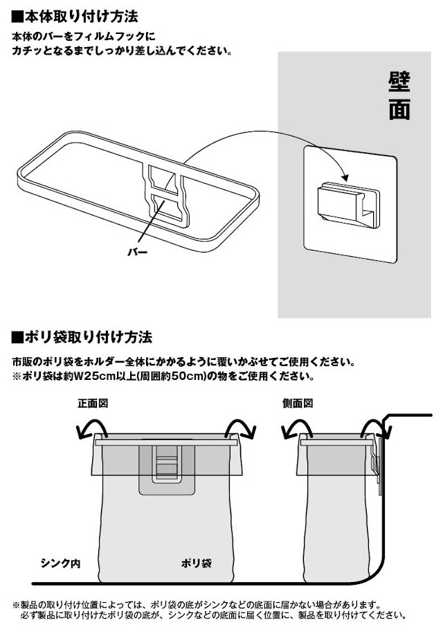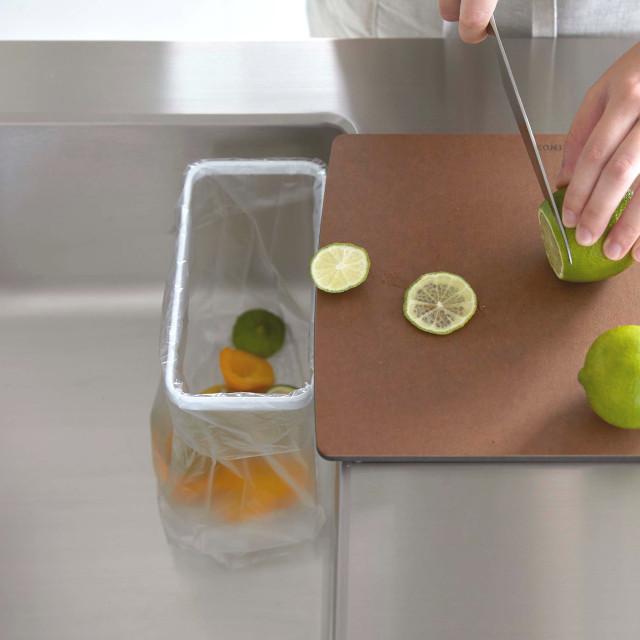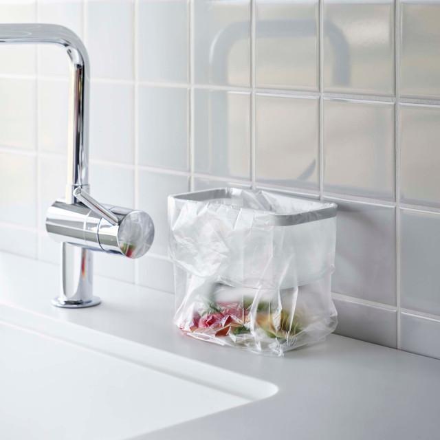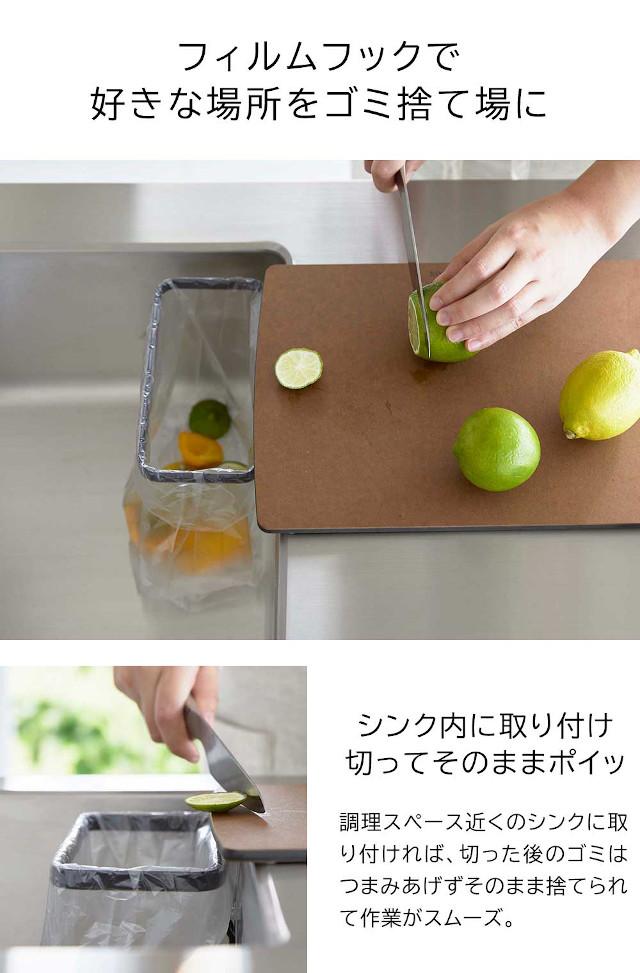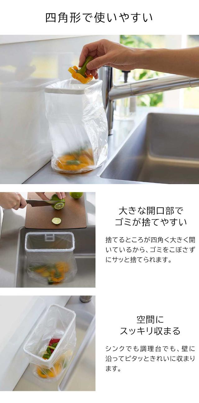 ポリ袋を掛けて調理中に出るゴミをその場でポイ!ポリ袋を掛けるだけの簡易ゴミ入れ。 |