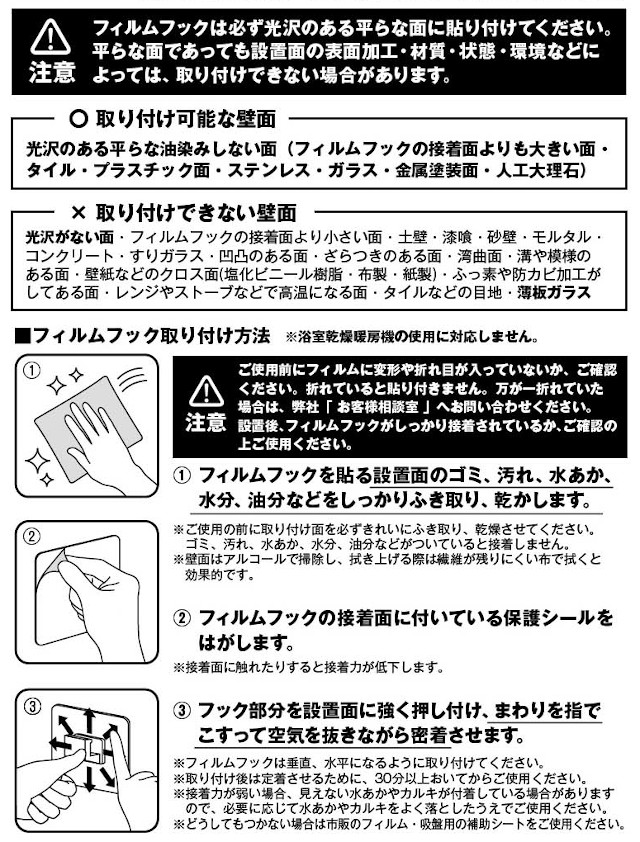 フィルムフックで光沢のある壁面のお好みの位置に簡単取り付け。