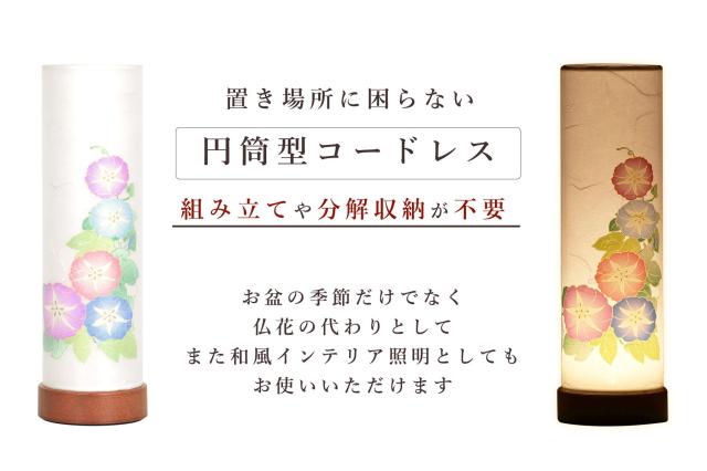 岐阜県の伝統工芸品に指定される「美濃和紙」、その質感を火袋(ひぶくろ)に。いにしえからの職人技術、伝統文化「盆のともしび」を後世へつなげ、温故知新。LED ローソク灯のあたたかな灯明が、しっとりとゆったりと、故人を想うお盆のひと時を演出します。 朝顔が咲いた、懐かしい夏のスクリーンに、かすむ思い出。いくつもの回想と感謝の気持ちを込めて、明りを灯します。伝統的な「提灯絵付け」の雰囲気を継承しながら、シンプルなシルエットは「和モダン・盆提灯」。 プッシュスイッチ式のコードレス、アルカリ単三電池2本を使用します。どこにでも置けるコンパクトなサイズの中でも、人気の円筒型をお探しの方にお勧めです。 |