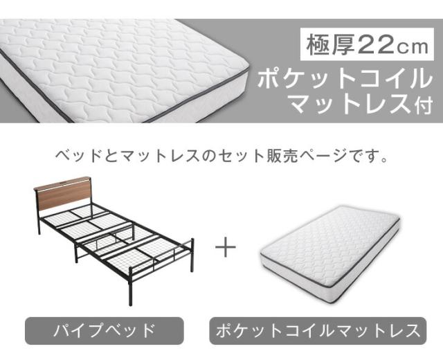 ポケットコイル マットレス付き 宮棚付き スチールベッド ダブル コンセント付き 脚 高さ調節 ベッド ベッドフレーム アイアン スチール パイプベッド ベッド マットレス付