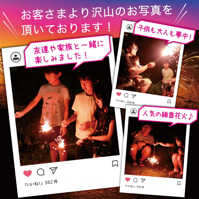 映えを意識して、花火の煙を約80%カット。煙が少ないので写真や動画を撮るのにぴったりです!みんなで楽しく夏を満喫しましょう!