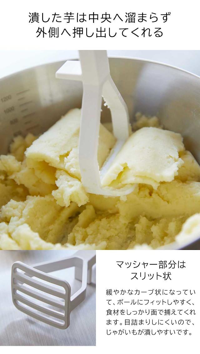 シリコーンハンドルで持ちやすく、マッシャー部分はボウルにフィットするカーブ形状で、芋を潰すのに最適。