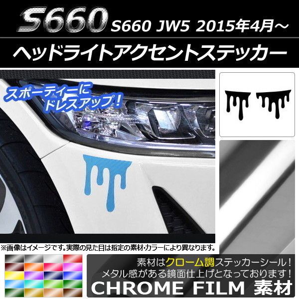 ヘッドライトアクセントステッカー クローム調 液だれ風 ホンダ S660 JW5 2015年4月〜 選べる20カラー 入数:1セット(2枚) AP-CRM1996 カラー: ブラック ホワイト レッド ブルー イエロー グリーン オレンジ パープル ピンク ネイビー ブラウン ボルドー ゴールド シルバー マゼンタ ダークグリーン ライトグリーン ライトブルー ローズゴールド シアン