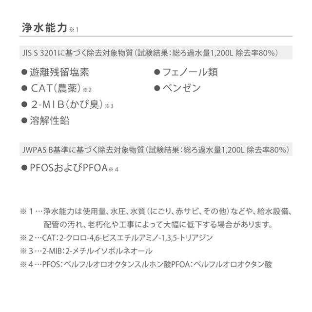 ※1…浄水能力は浄水使用量、水圧、水質(にごり、赤サビ、その他)などや、 給水設備、配管の汚れ、老朽化や工事によって大幅に低下する場合があります。