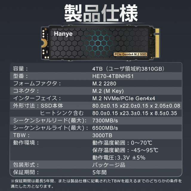Hanye SSD 4TB PCIe Gen4x4 M.2 NVMe 2280 ヒートシンク搭載 3D TLC PS5 Pro/PS5 Slim/PS5動作確認済み R:7300MB/s W:6500MB/s HE70 国内5年保証 宅配便配送 ポイント消化