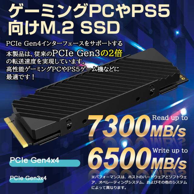 ※表記の速度は理論上における最大速度となり、実際には使用環境により変化します。PS5では最大転送速度約6600MB/sをサポートするため、この商品に表記されている7300MB/sの性能は発揮できません。