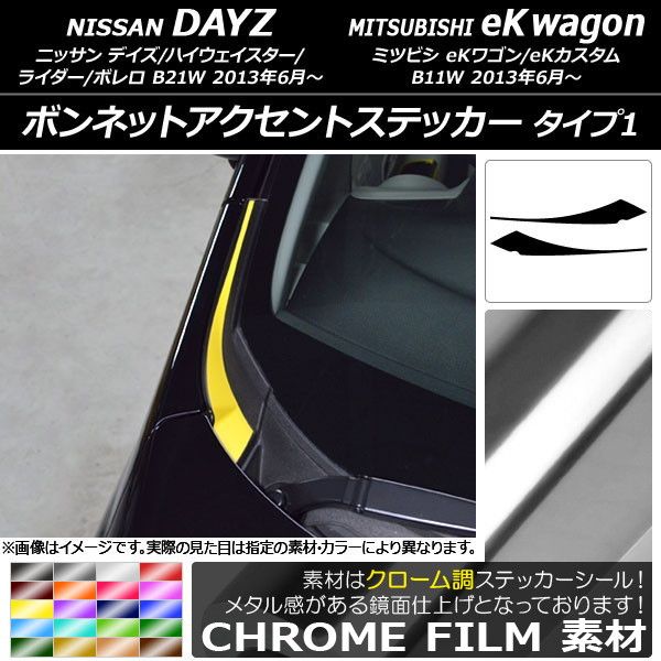 ボンネットアクセントステッカー クローム調 タイプ1 ニッサン/ミツビシ デイズ/eKワゴン B21W/B11W 選べる20カラー 入数:1セット(2枚) AP-CRM3619 カラー: ブラック ホワイト レッド ブルー イエロー グリーン オレンジ パープル ピンク ネイビー ブラウン ボルドー ゴールド シルバー マゼンタ ダークグリーン ライトグリーン ライトブルー ローズゴールド シアン