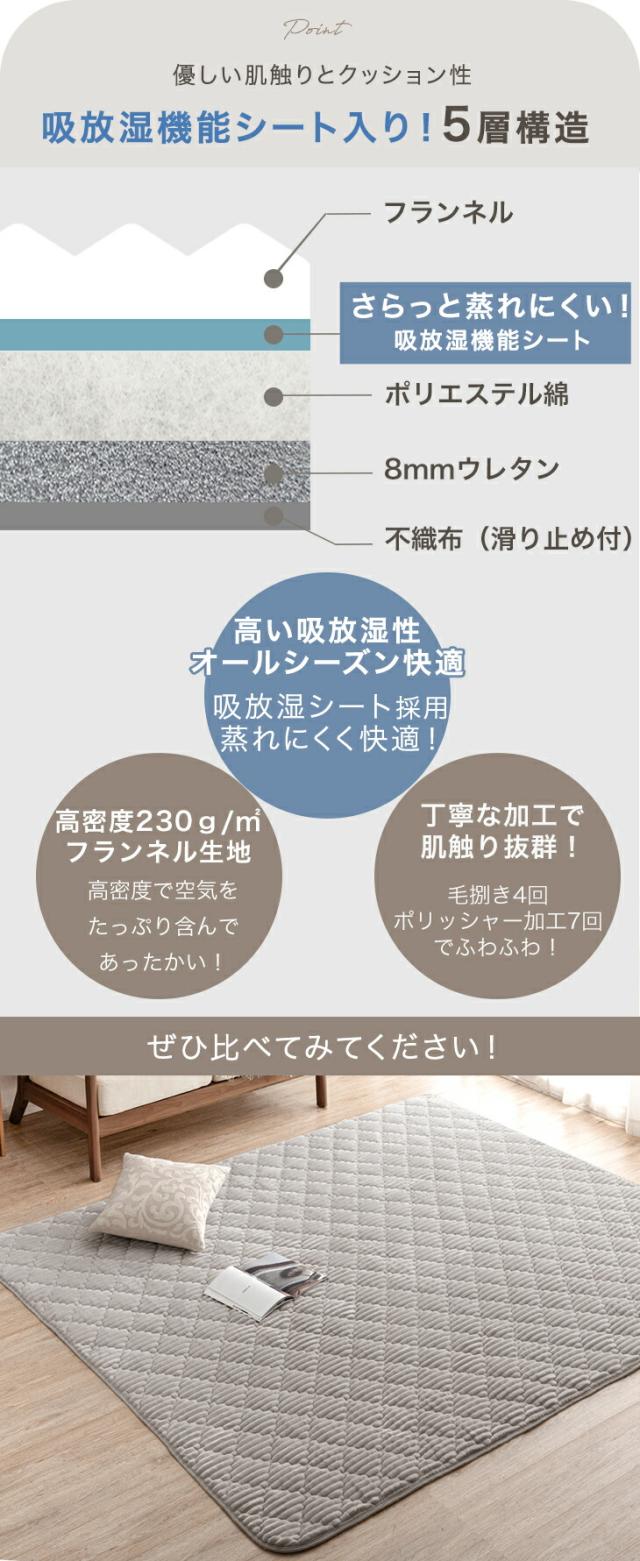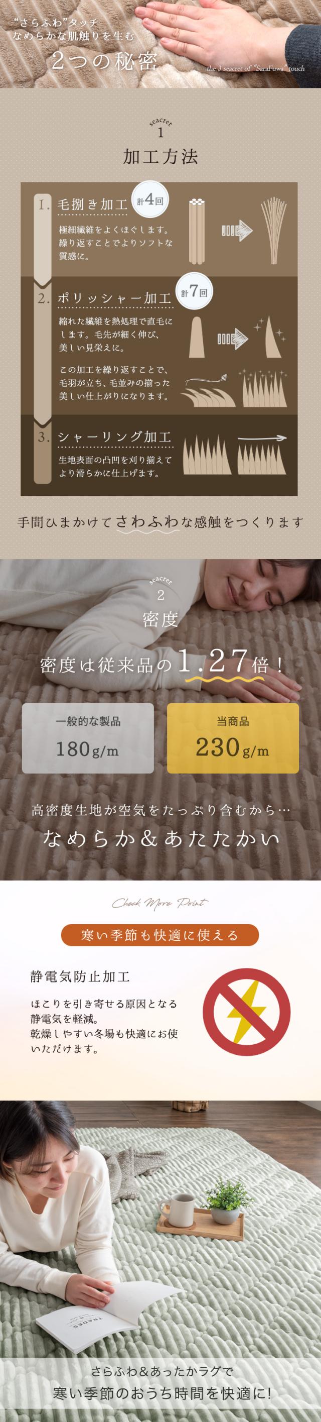 - 肌触りすべすべ。 厚みがあって温かく、気持ちいいです。 毛足がそんなに長くないので掃除もラクです。 買って良かった。