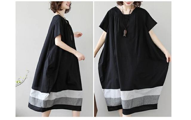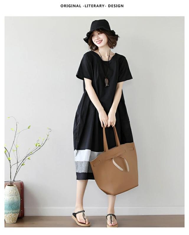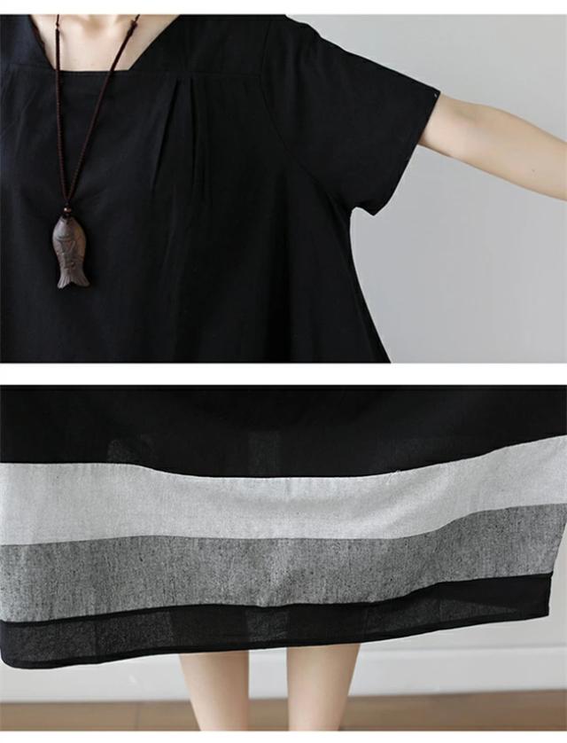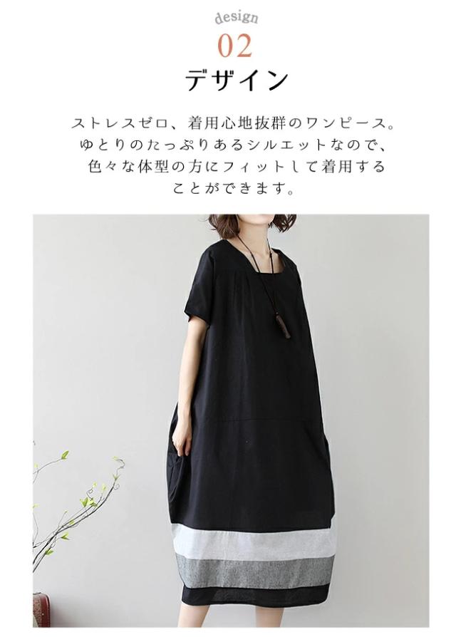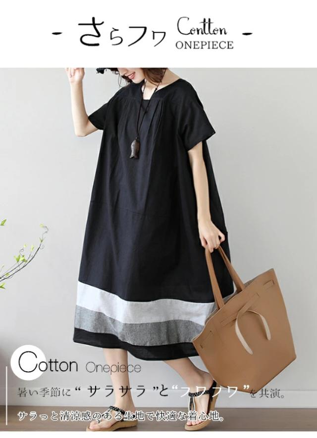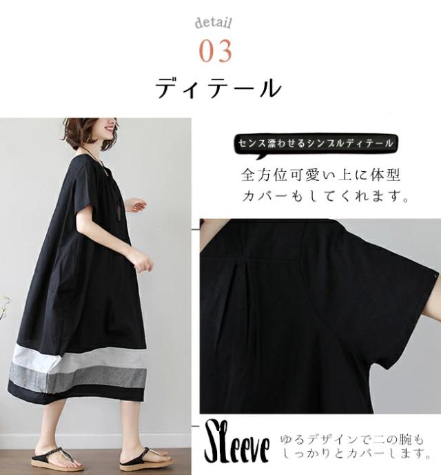 夏新作 ワンピース レディース きれいめ コクーン ゆったり 半袖 ロング ミモレ丈 裾ボーダー 切り替え 夏 カジュアル 綿 黒 ブラック シンプル 体型カバー マタニティー 大人 服