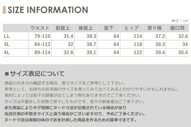 3L:ウエスト84-112 前股上32 後股上38.7 股下64 ヒップ118 渡り幅38.3 裾口周34