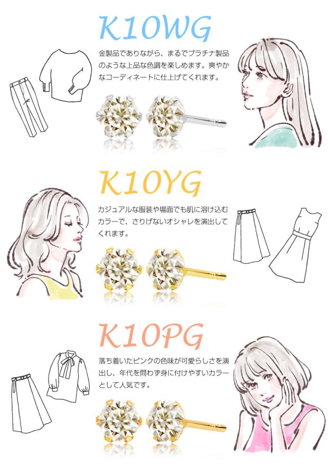 K10のホワイトゴールド、イエローゴールド、ピンクゴールドの3色からお好きな色をお選びいただけます。