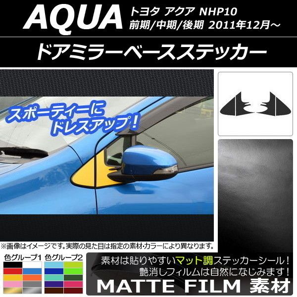 ドアミラーベースステッカー マット調 トヨタ アクア NHP10 前期/中期/後期 2011年12月〜 色グループ2 入数:1セット(4枚) AP-CFMT529 色グループ2: パープル ブラウン ボルドー マゼンタ ダークグリーン ダークブルー ライトイエロー ライトグリーン ライトブルー シアン
