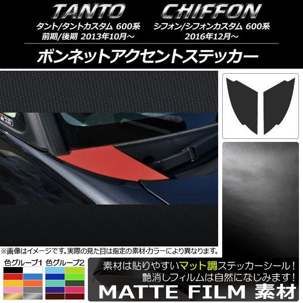 ボンネットアクセントステッカー マット調 ダイハツ/スバル タント/カスタム、シフォン/カスタム 600系 色グループ2 入数:1セット(2枚) AP-CFMT913 色グループ2: パープル ブラウン ボルドー マゼンタ ダークグリーン ダークブルー ライトイエロー ライトグリーン ライトブルー シアン