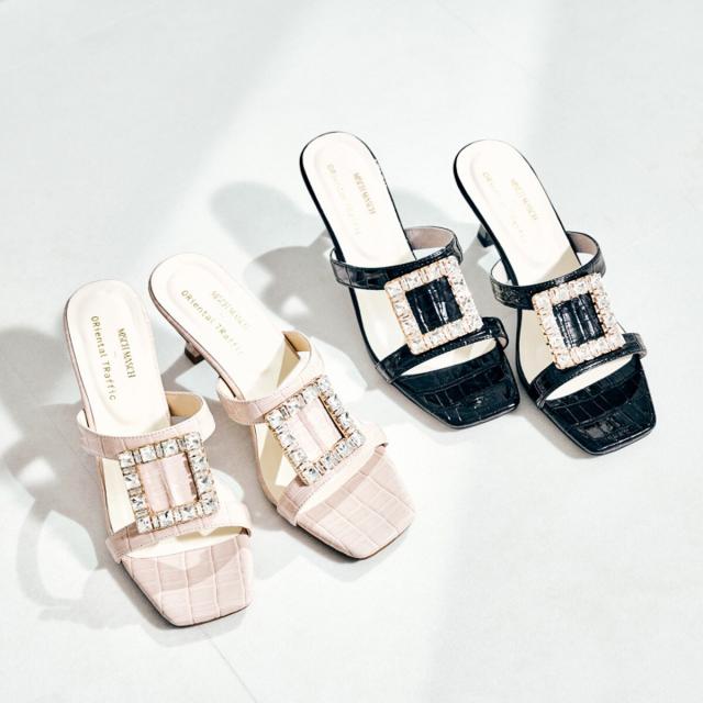 存在感のあるビジューバックルと華奢なアッパーデザイン、艶のあるエナメルの型押し素材がエレガントな印象のミュールサンダル。