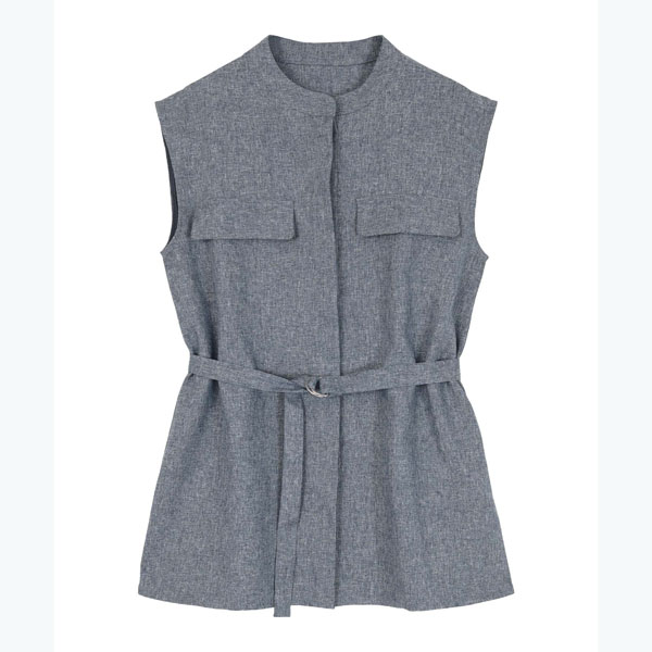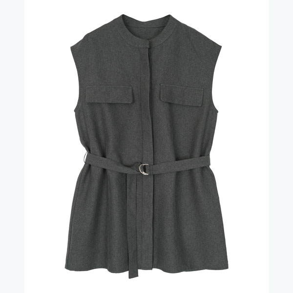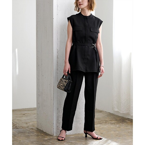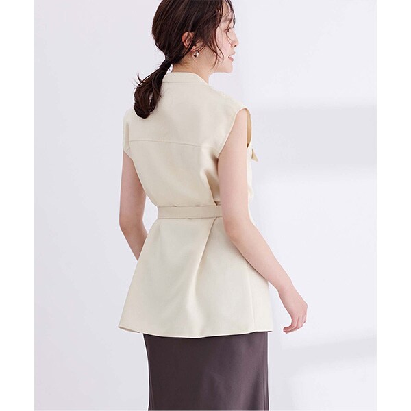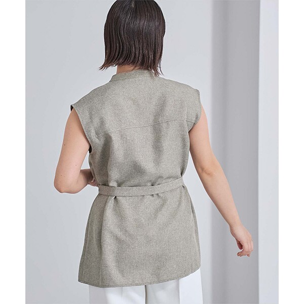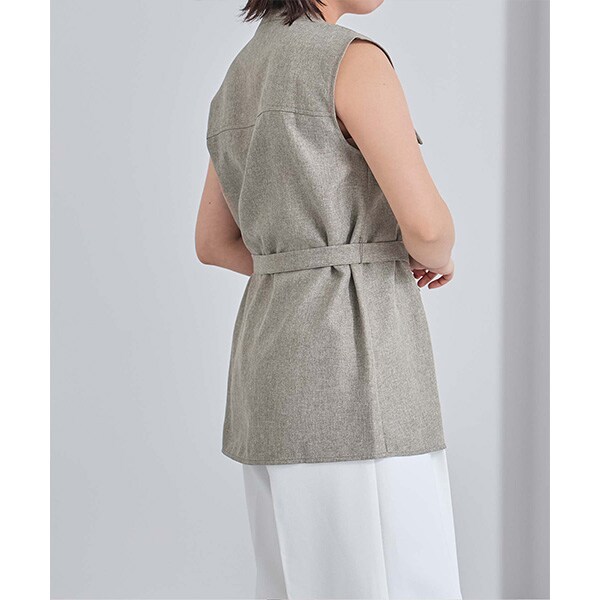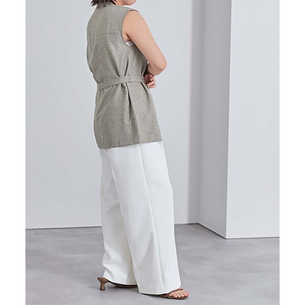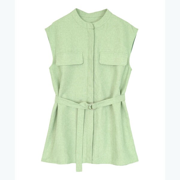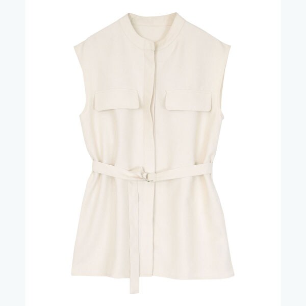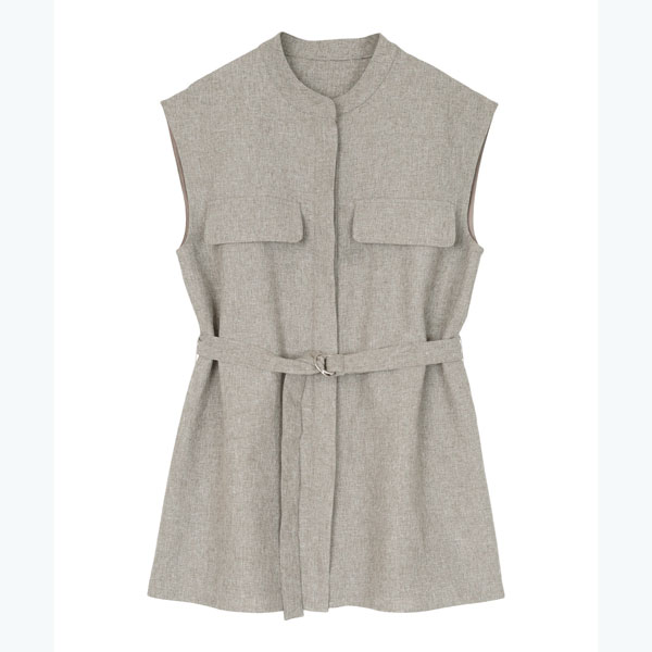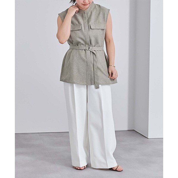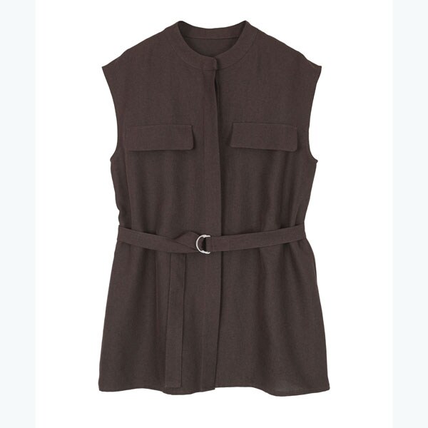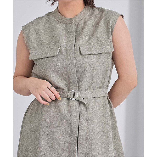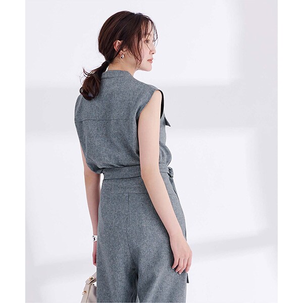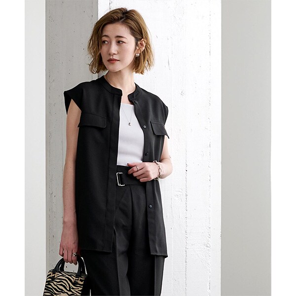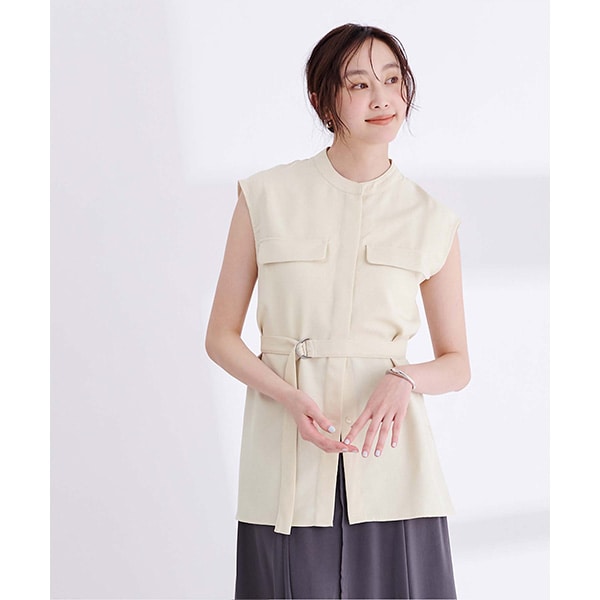 バンドカラーで襟元がすっきりとまとまるリネンライクノースリーブトップス。