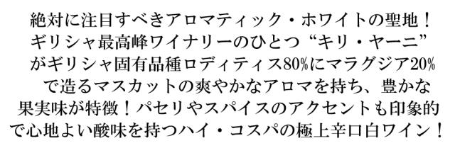 絶対に注目すべきアロマティック・ホワイトの聖地! ギリシャ最高峰ワイナリーのひとつ“キリ・ヤーニ” がギリシャ固有品種ロディティス80%にマラグジア20% で造るマスカットの爽やかなアロマを持ち、豊かな果実味が特徴!パセリやスパイスのアクセントも印象的で心地よい酸味を持つハイ・コスパの極上辛口白ワイン!■さまざまなギフトアイテムをご用意しております。