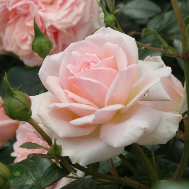 淡い杏色の花は開くにつれクリームピンクに変化します。