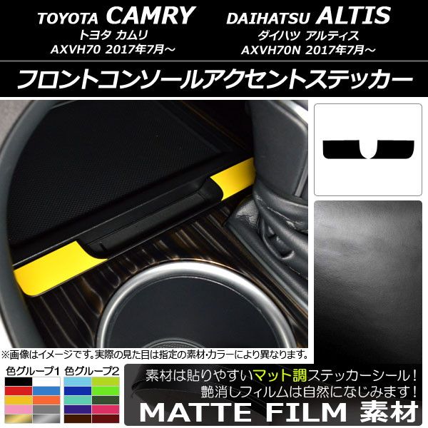 フロントコンソールアクセントステッカー マット調 トヨタ/ダイハツ カムリ/アルティス XV70系 2017年07月〜 色グループ2 入数:1セット(2枚) AP-CFMT3165 色グループ2: パープル ブラウン ボルドー マゼンタ ダークグリーン ダークブルー ライトイエロー ライトグリーン ライトブルー シアン