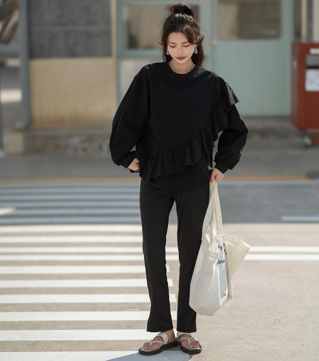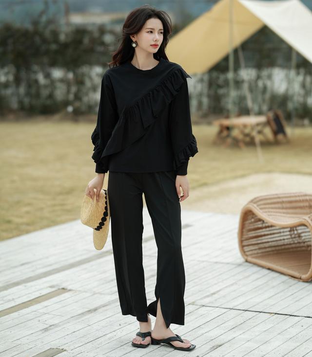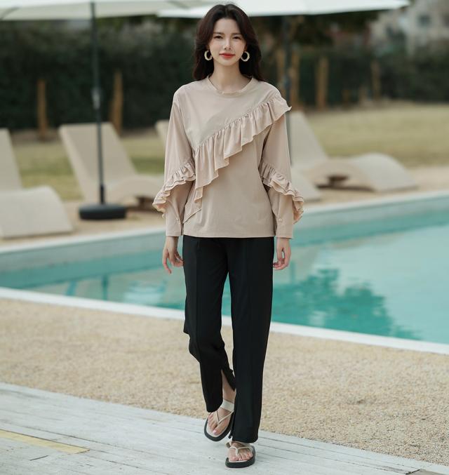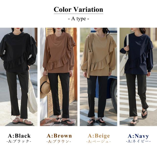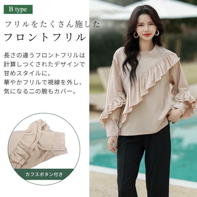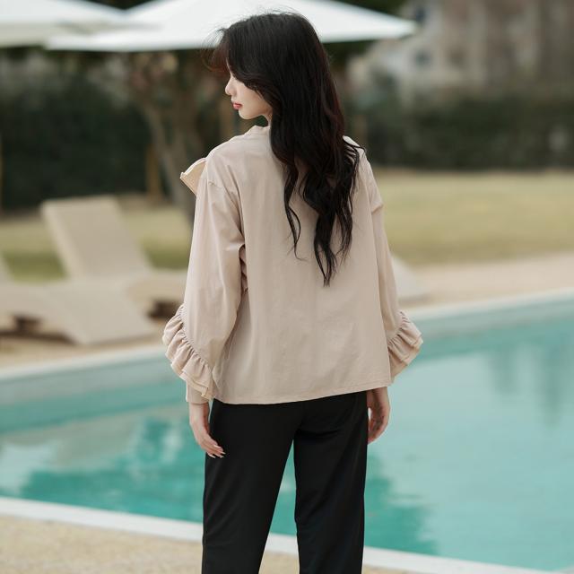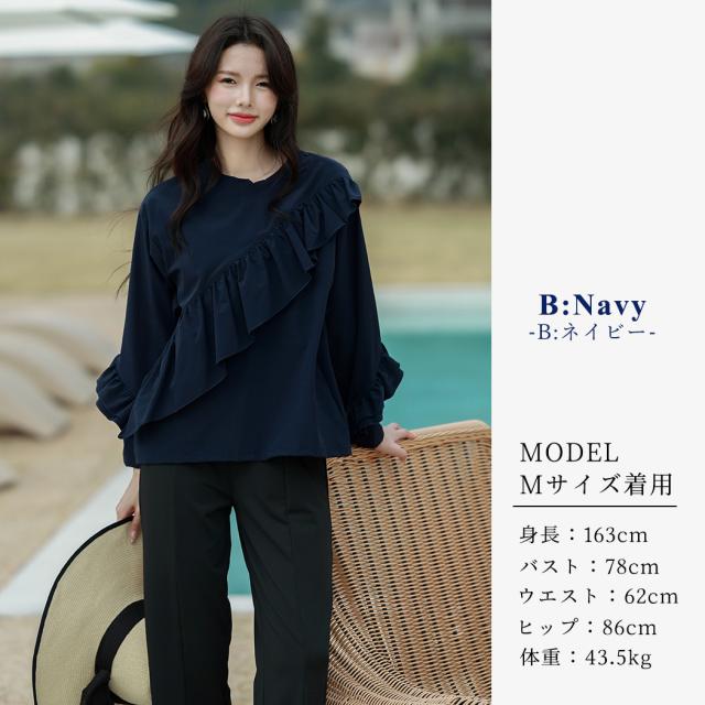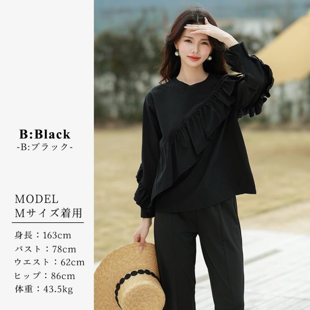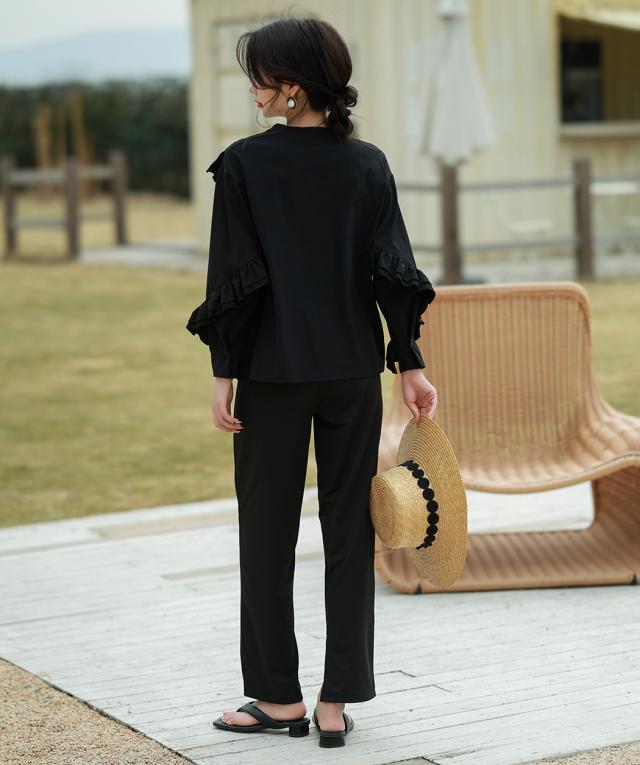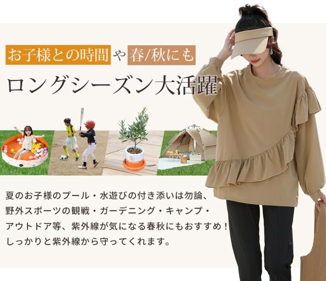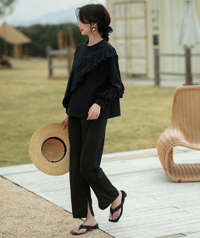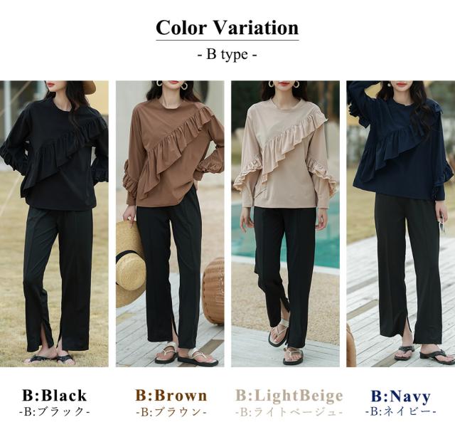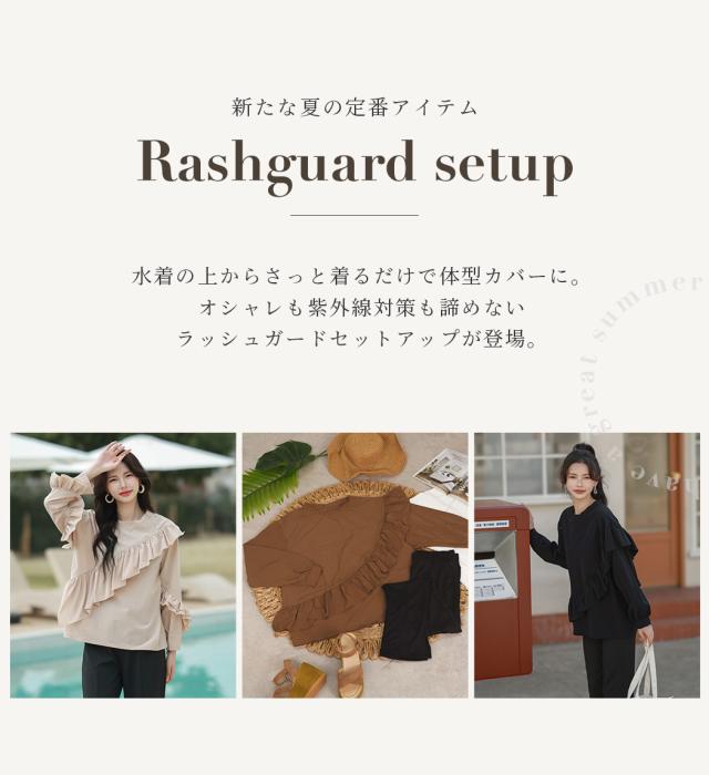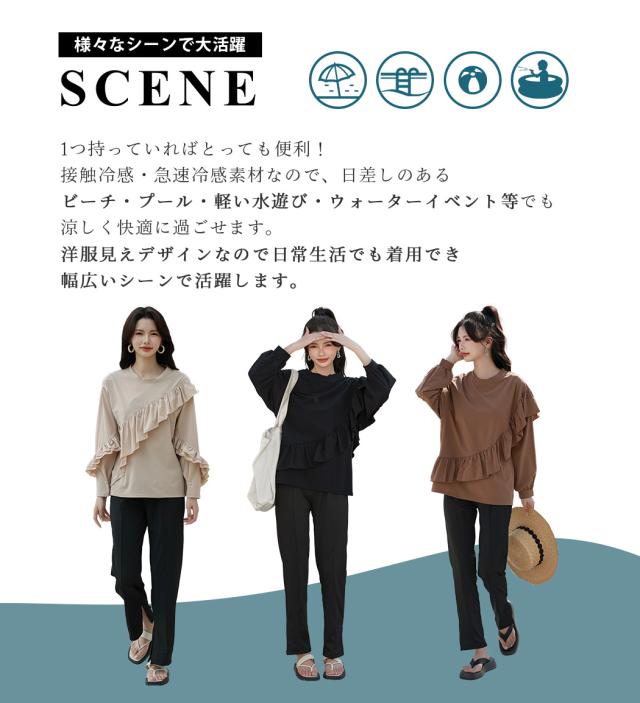 春新作 接触冷感 UVカット率 99%以上 ラッシュガード レディース 長袖 セットアップ 水陸両用水着 UPF50+ ひんやり フードなし ボトムス パンツ 体型カバー 2点セット 薄手 フリル 黒 パフスリーブ 二の腕 ウエスト ヒップ 太もも 脚 カバーアップ