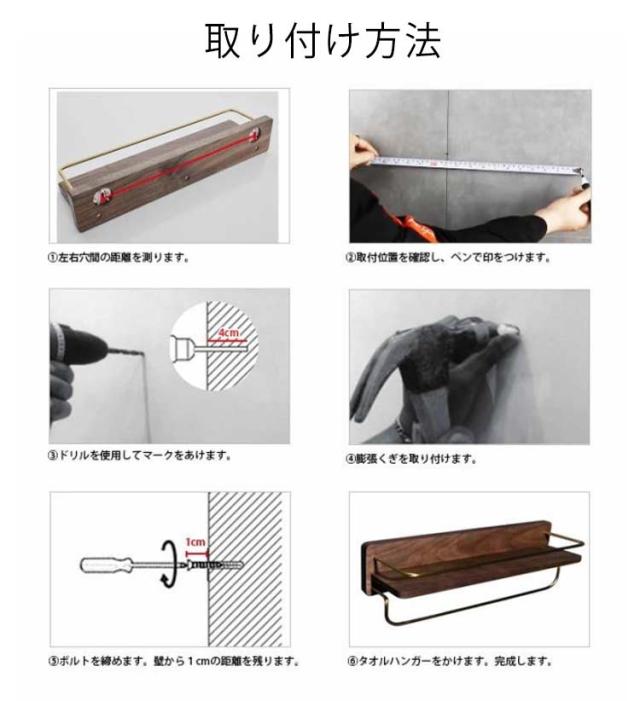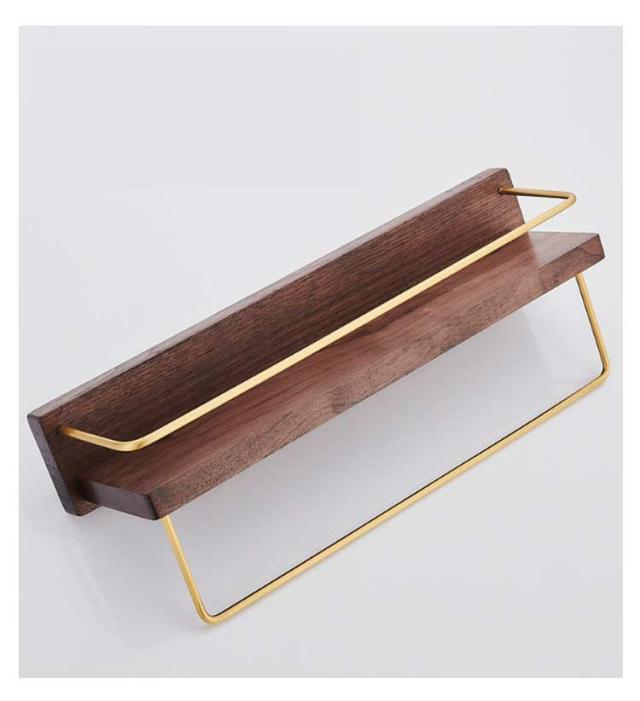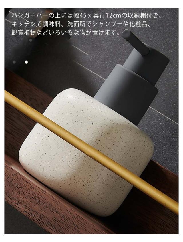 | 小物収納もできる便利な天然木の棚付きのタオルハンガー。 ヴィンテージ感のある天然木が洗面所やトイレ、キッチンなどの水回りの印象をおしゃれに演出します。 ハンガーバーの上には幅45x奥行12cmの収納棚付き。キッチンで調味料、洗面所でシャンプーや化粧品、観賞植物などいろいろな物が置けます。 バーは無駄のないスリムなデザインでタオルの取り換えも簡単。角を丸いのでぶつけて怪我をしにくいです。S字フックをかければスポンジや泡立てネットなどの収納も可能。 棚にも落下防止のバー付きで安心のタオル掛けハンガーです。 棚部分は高級感溢れるクルミ木材を使用。フレームは傷や水に強い粉体塗装を施したアルミ製。キッチンやトイレなどで水に濡れてもサッとひと拭きでOK。 | |