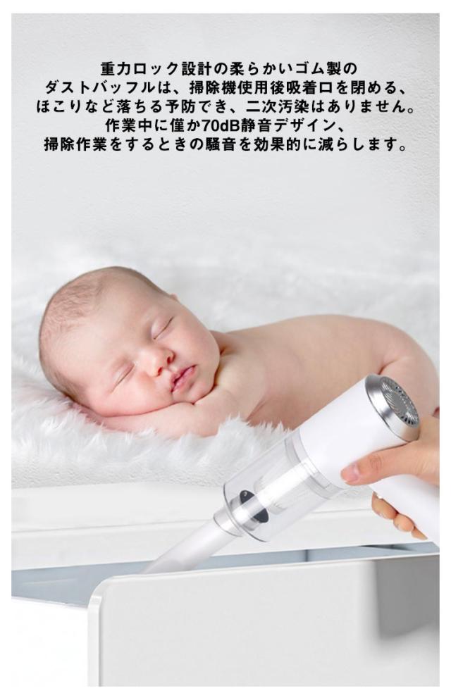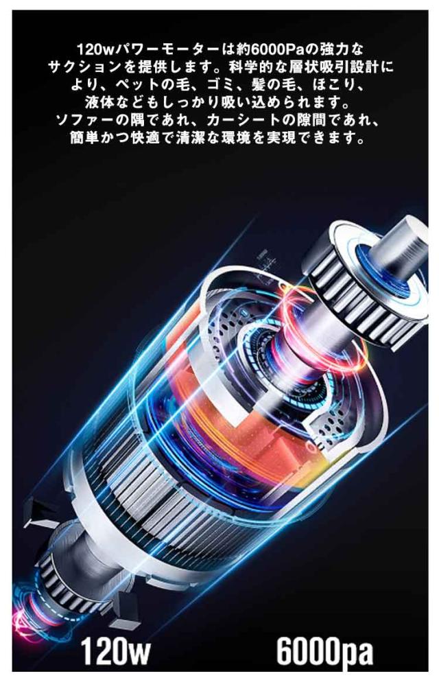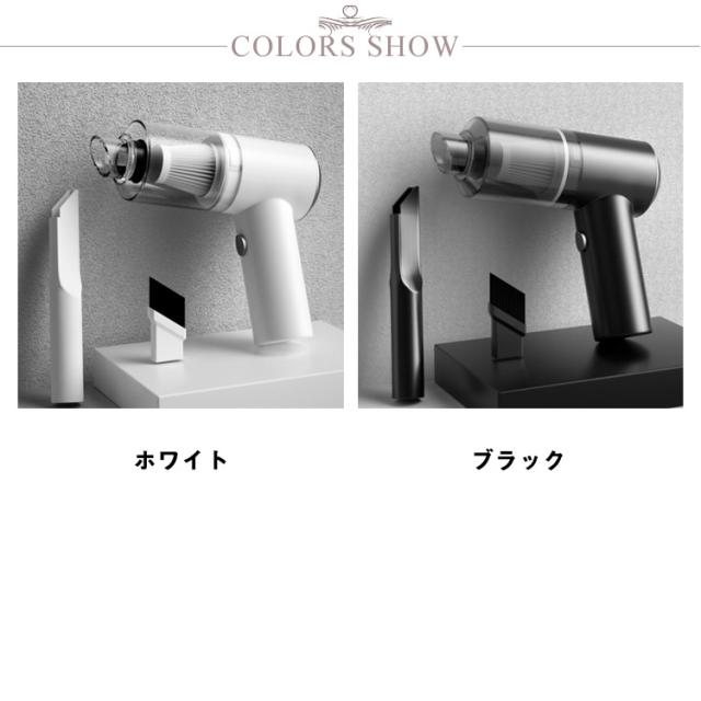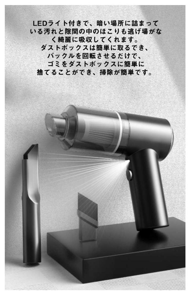 | 【吸引力抜群・乾湿両用】120wパワーモーターは約6000Paの強力なサクションを提供します。科学的な層状吸引設計により、ペットの毛、ゴミ、髪の毛、ほこり、液体などもしっかり吸い込められます。ソファーの隅であれ、カーシートの隙間であれ、簡単かつ快適で清潔な環境を実現できます。 【軽量・コンパクト】重さは僅か400gであり、軽量で便利なハンディクリーナーです。持ちやすい、片手で長時間使用、腕は痛みを感じません、女性や子供も楽にご利用いただけます。ミニサイズで収納しやすい、強い吸収力を持ちます。 【30分連続稼働】USBフル充電後30分間ぐらい連続使用可能、待ち受け時間は30日間ぐらいに達します。車内だけでなくハンディークリーナーとして家の中やオフィスでも使えます。 【LEDライト付き】LEDライト付きで、暗い場所に詰まっている汚れと隙間の中のほこりも逃げ場がなく綺麗に吸収してくれます。ダストボックスは簡単に取るでき、バックルを回転させるだけで、ゴミをダストボックスに簡単に捨てることができ、掃除が簡単です。 【ダストバッフル・静音】重力ロック設計の柔らかいゴム製のダストバッフルは、掃除機使用後吸着口を閉める、ほこりなど落ちる予防でき、二次汚染はありません。作業中に僅か70dB静音デザイン、掃除作業をするときの騒音を効果的に減らします。 【使用方法簡単】 1、初めてご使用する場合は、フル充電にしてください。充電中赤いライト点灯、充電完了後緑ライト点灯します。 2、使用場所によりノズルを選択します。 3、電源ボタンを押して作動します。 | |