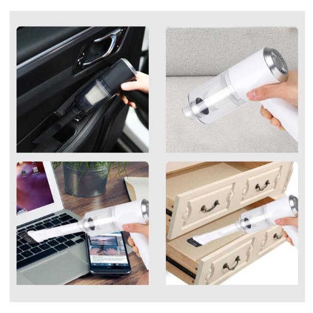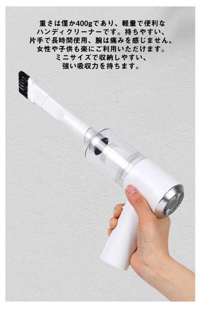 | サイズについての説明 | サイズ:16.5*14.5*4cm 重量400g 製品効率:120W 電池容量:2000mAh×2 連続使用:30min 電源:usb充電 吸引力:6000PA 内容セット:掃除機本体、フィルター、隙間ノズル、ブラシ付きノズル、USB充電ケーブル×1。 |