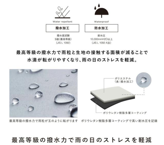 Water proof表面張力を高めた超撥水加工で雨粒が玉の様に転がります。撥水度試験5等級(最高等級)(JIS L 1092法)