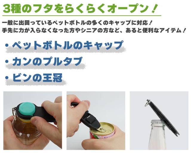 3in1オープナー キャップ プルタブ フタ 王冠 オープナー ペットボトル 缶 瓶 栓抜き コンパクト キーホルダー 携帯 持ち運び 開封 開栓